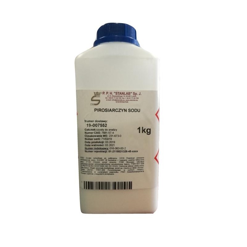 Nazwa substancji: PIROSIARCZAN SODU Wzór chemiczny: Na2S2O5 Numer CAS: 13870-29-6 Numer WE: 237-625-5 |
